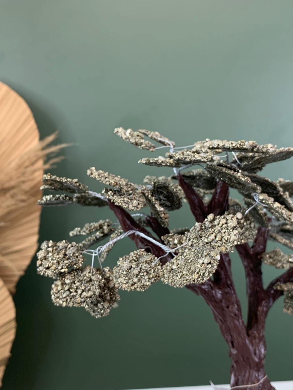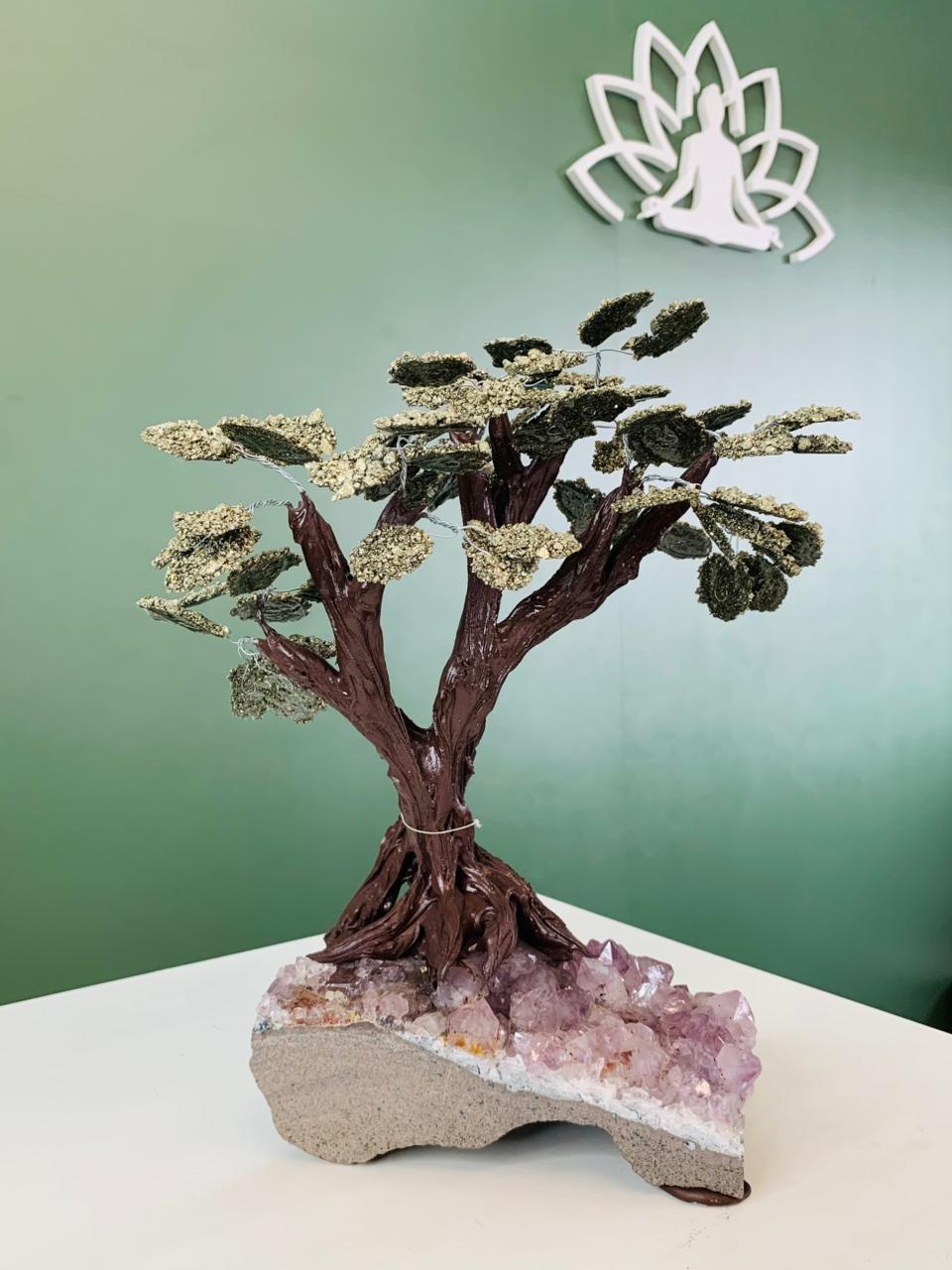 A árvore de ametista com folhas de pirita é uma peça decorativa que une simbolismo, energia e sofisticação. Inspirada na árvore da vida, representa crescimento, estabilidade e expansão. A combinação da ametista com a pirita cria um equilíbrio entre proteção, clareza e prosperidade.