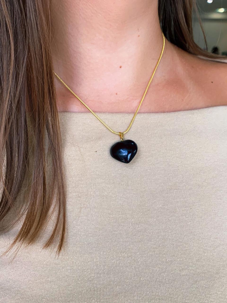 O colar em formato de coração simboliza força emocional e profundidade. A obsidiana é associada à proteção energética e ao autoconhecimento, sendo conhecida por auxiliar na liberação de energias densas e no fortalecimento interior.