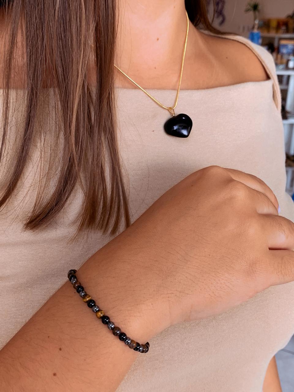 A pulseira combina Olho de Tigre, Hematita e Ágata Negra, uma união ligada à coragem, aterramento e estabilidade. Juntas, essas pedras reforçam a sensação de segurança, foco e firmeza diante dos desafios.