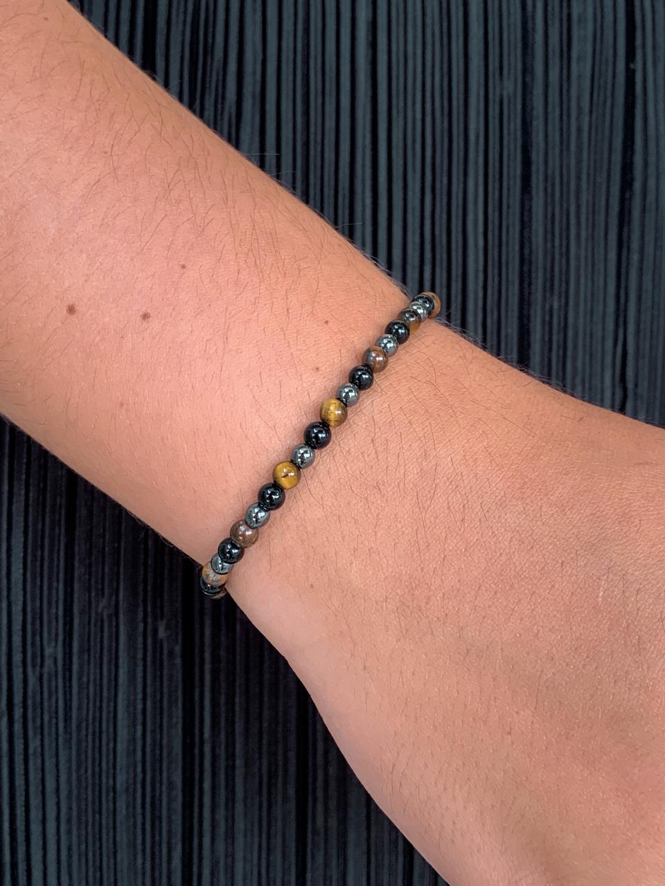 Com seu brilho dourado e reflexos intensos, o Olho de Tigre é associado à coragem, foco e autoconfiança. O colar traz presença e personalidade ao visual, tornando-se um símbolo de firmeza e direção. A pulseira combina Olho de Tigre, Hematita e Ágata Negra, formando uma união poderosa de proteção e estabilidade.