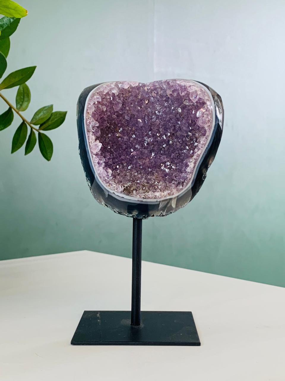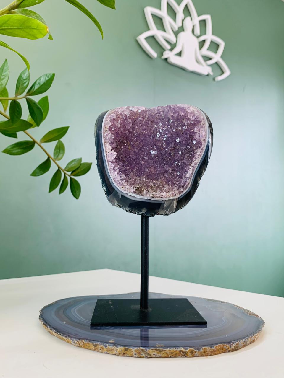 Além do significado energético, a drusa de ametista é uma peça decorativa sofisticada. Seu tom violeta intenso e o brilho natural dos cristais tornam cada peça única.