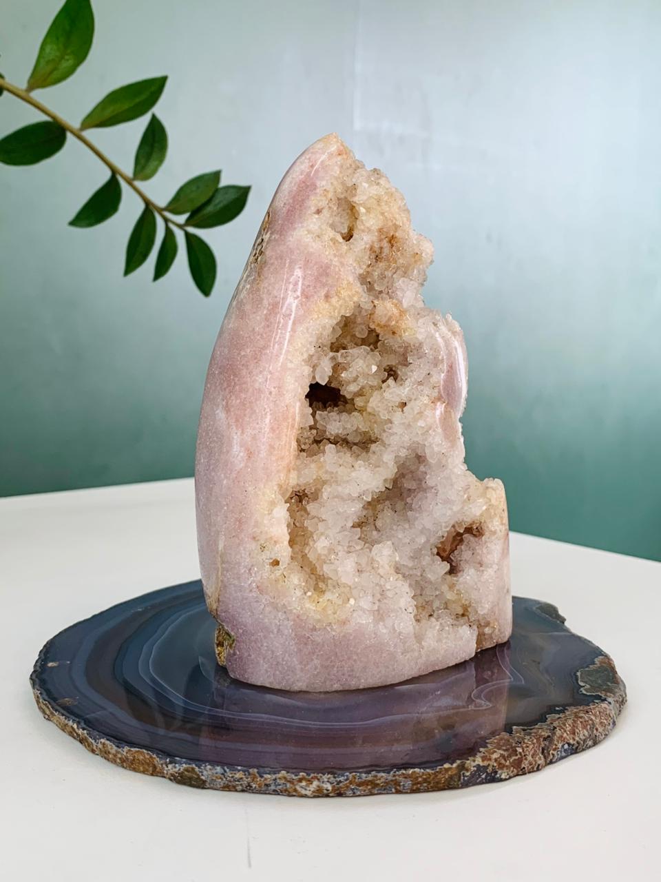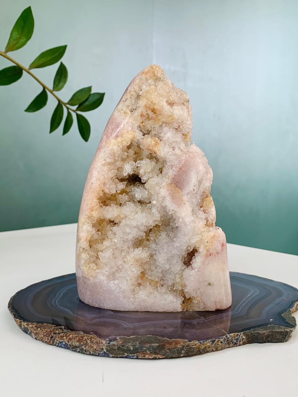 A drusa de ametista rosa é uma formação natural composta por diversos cristais unidos em uma base, destacando-se pelo seu tom suave e delicado.