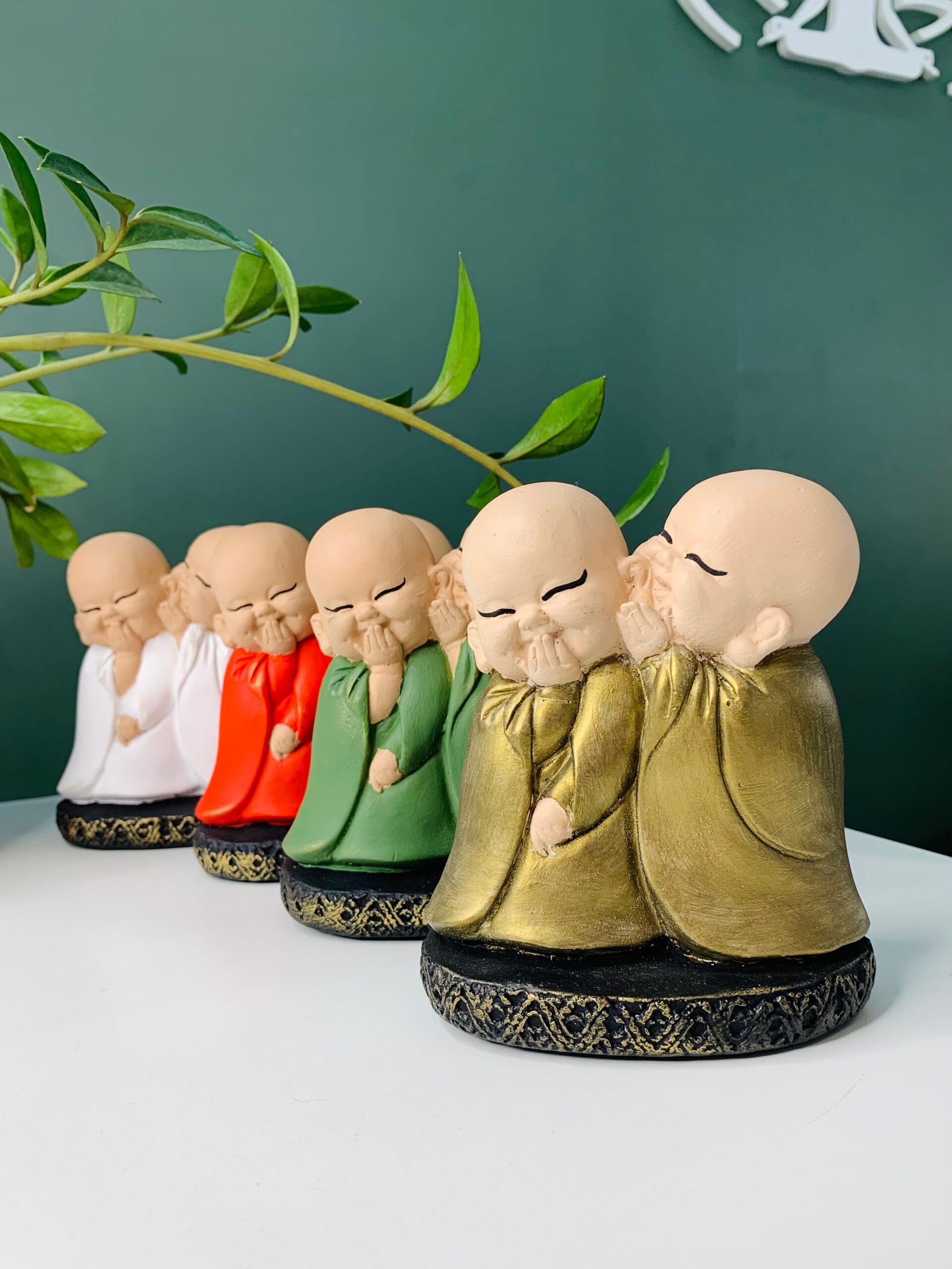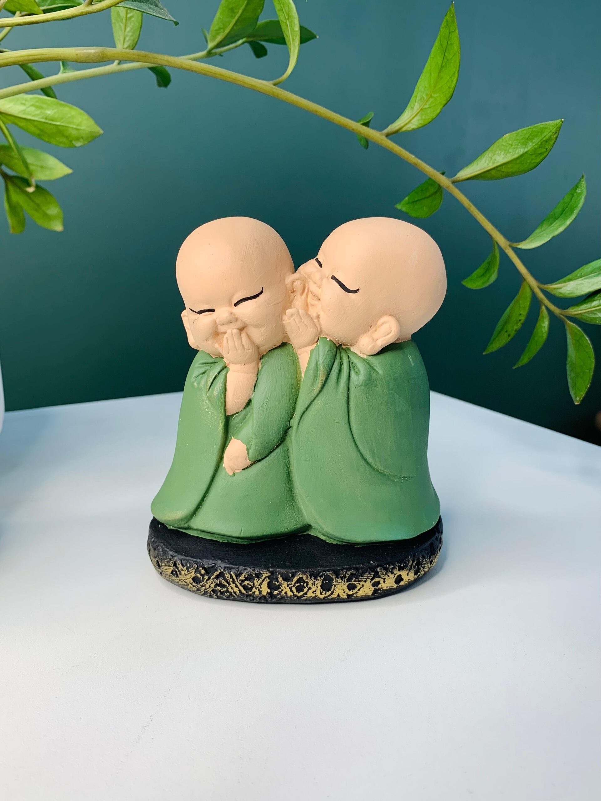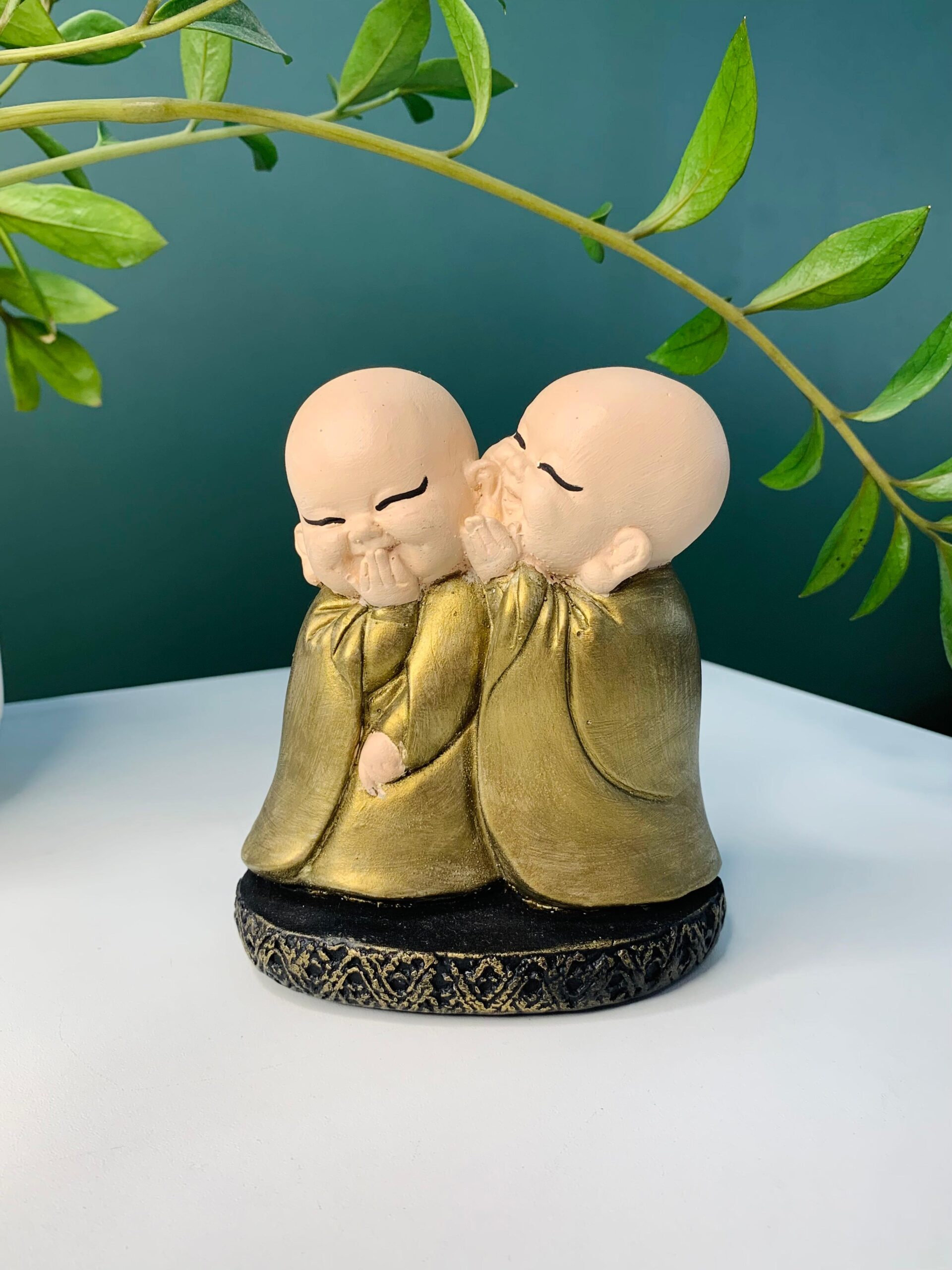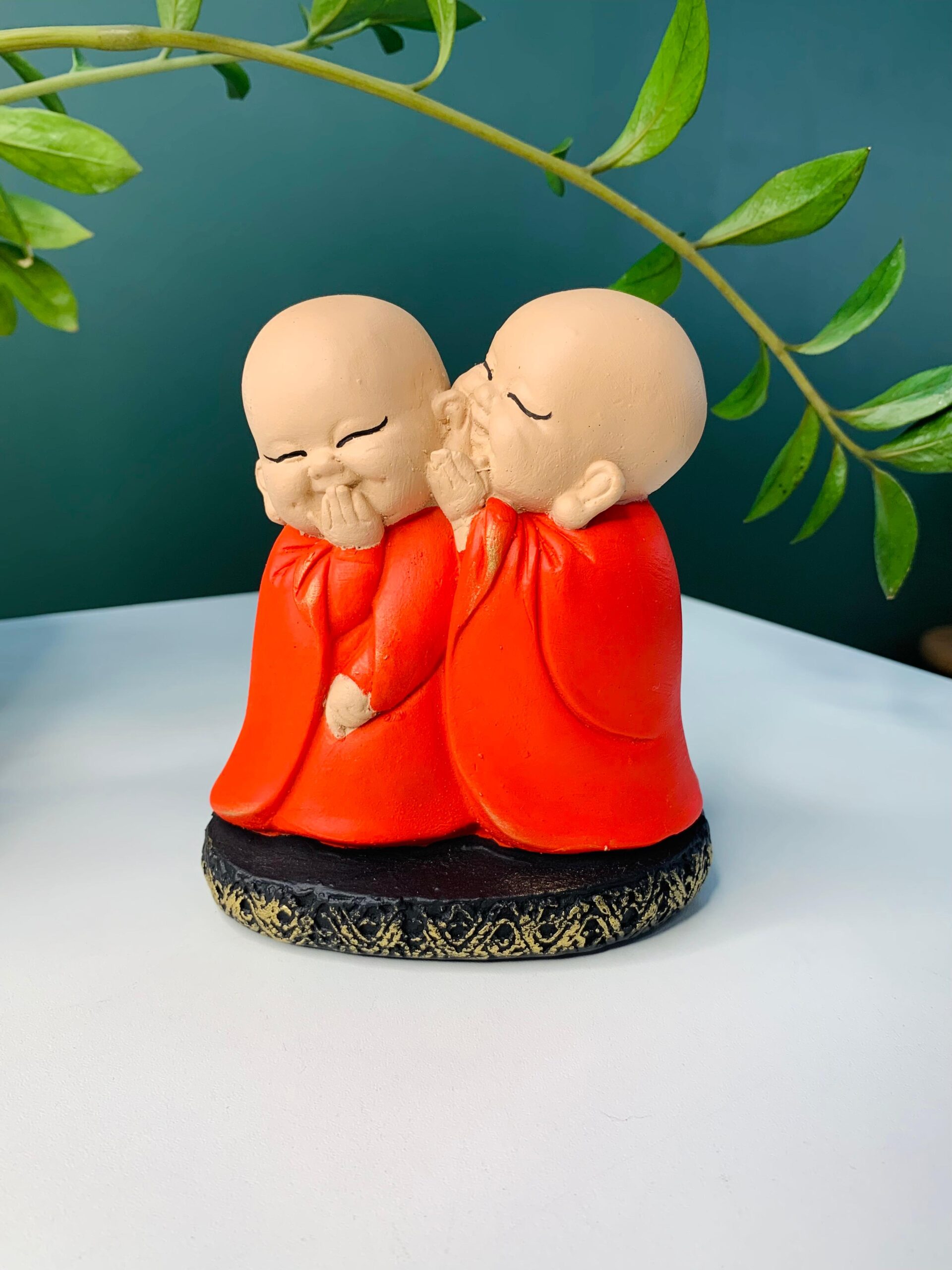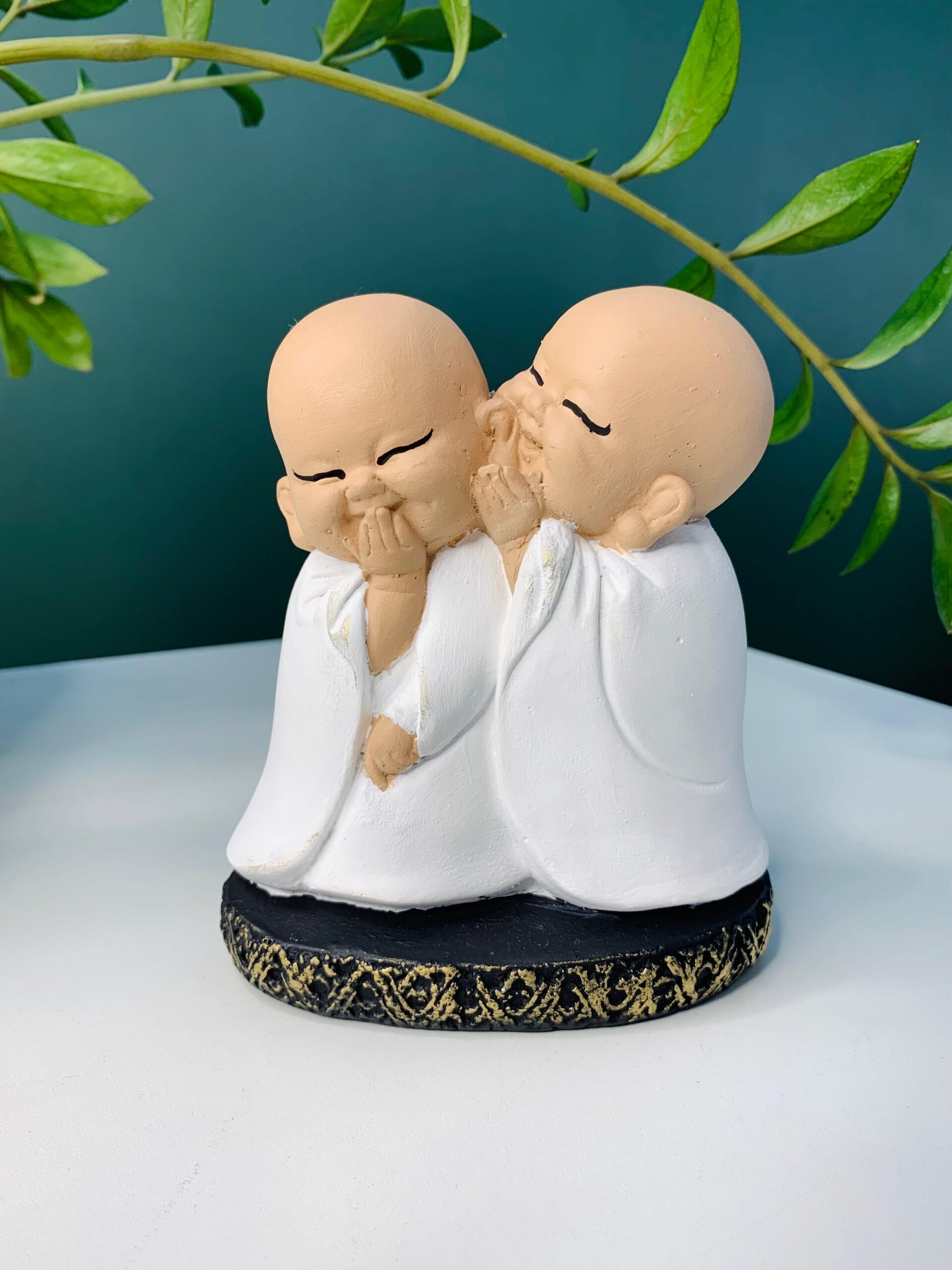 Ideal para compor espaços de meditação, salas, escritórios ou locais de descanso, a dupla de monges sussurrando transmite uma energia de calma e contemplação.