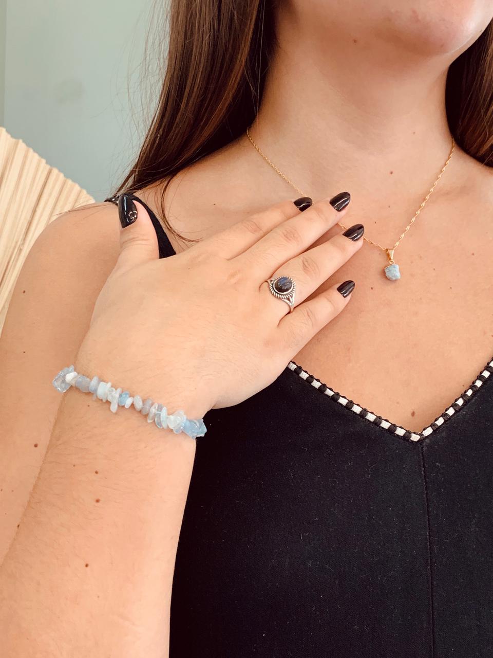 * Pulseira de Cascalho de Água-marinha – Atua na calma emocional, ajuda a aliviar tensões e favorece a clareza mental, mantendo a energia leve e harmoniosa.