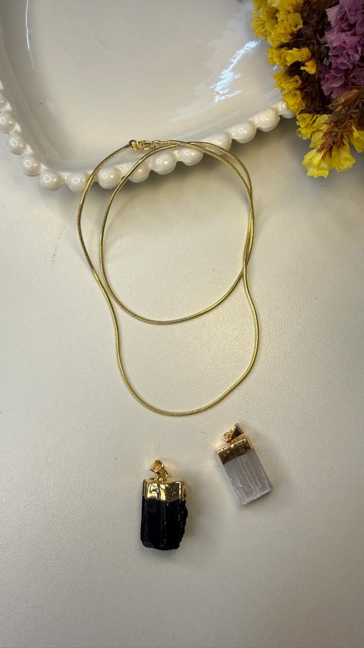 * Pingente de Selenita – Conhecida por sua vibração purificadora, auxilia na limpeza energética, clareza mental e elevação espiritual.