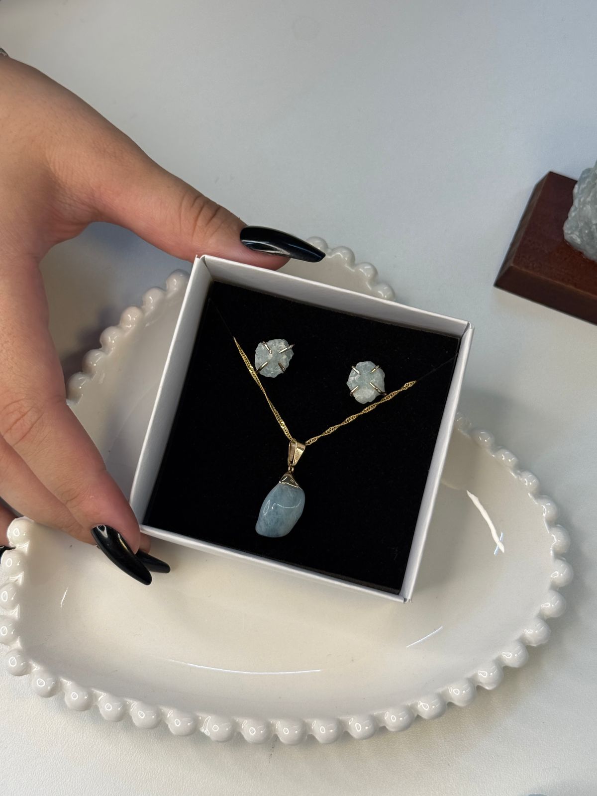 * Par de Brincos de Água-marinha – Complementa o conjunto com brilho e delicadeza, elevando a vibração de paz e harmonia.