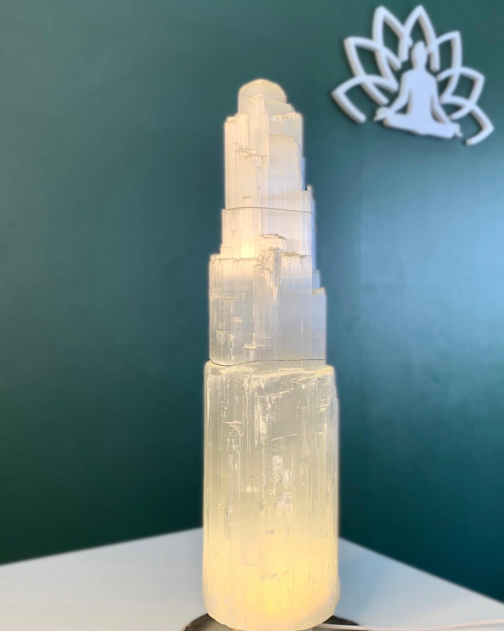A torre de selenita com LED é uma peça que une energia, iluminação e sofisticação em um único elemento decorativo.