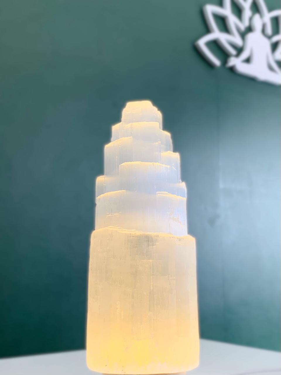 A torre de selenita com LED é uma peça que une energia, iluminação e sofisticação em um único elemento decorativo.